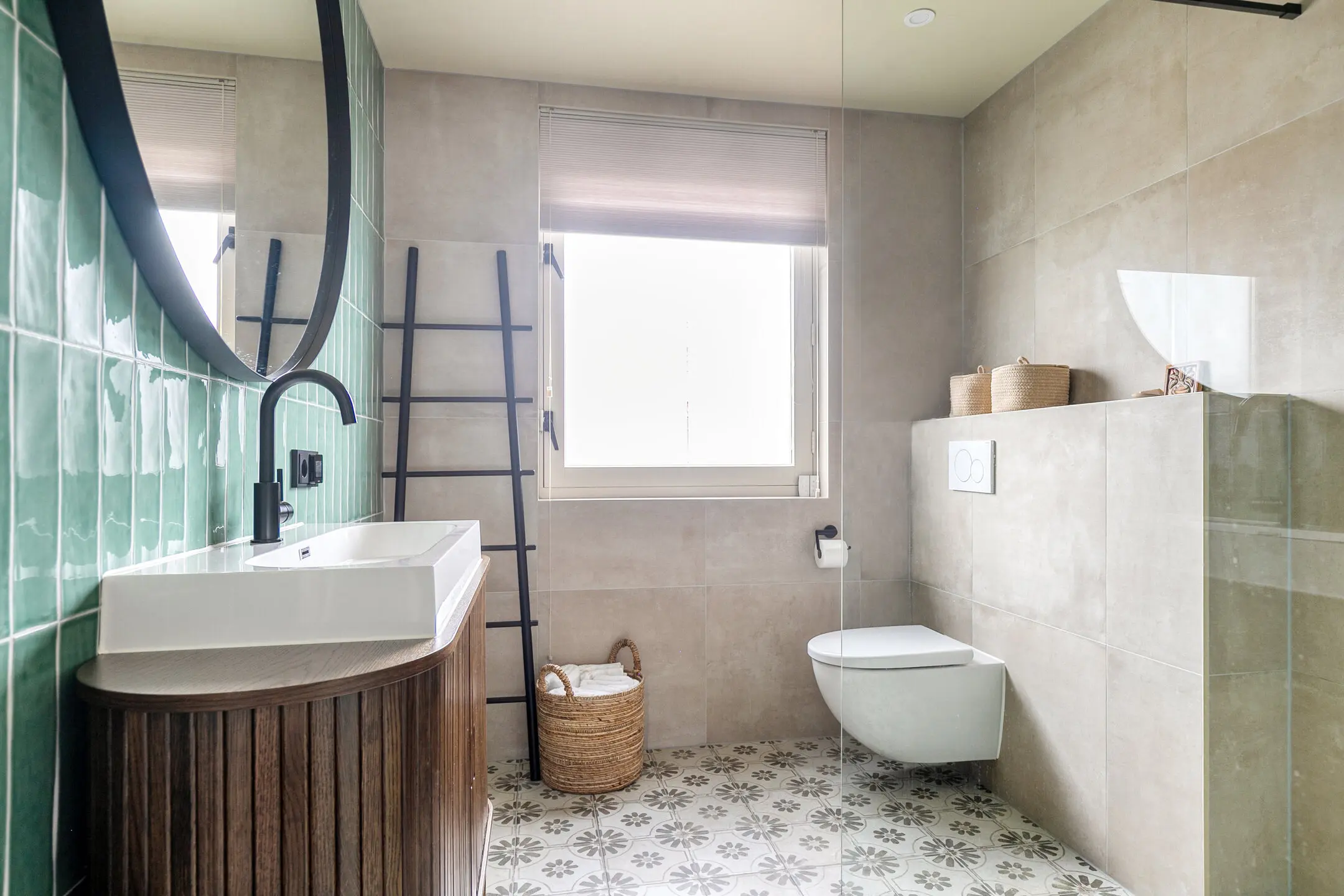 Luxe badkamer in (2023 geïnstalleerd) met vloerverwarming, wastafelmeubel, toilet en inloopdouche.