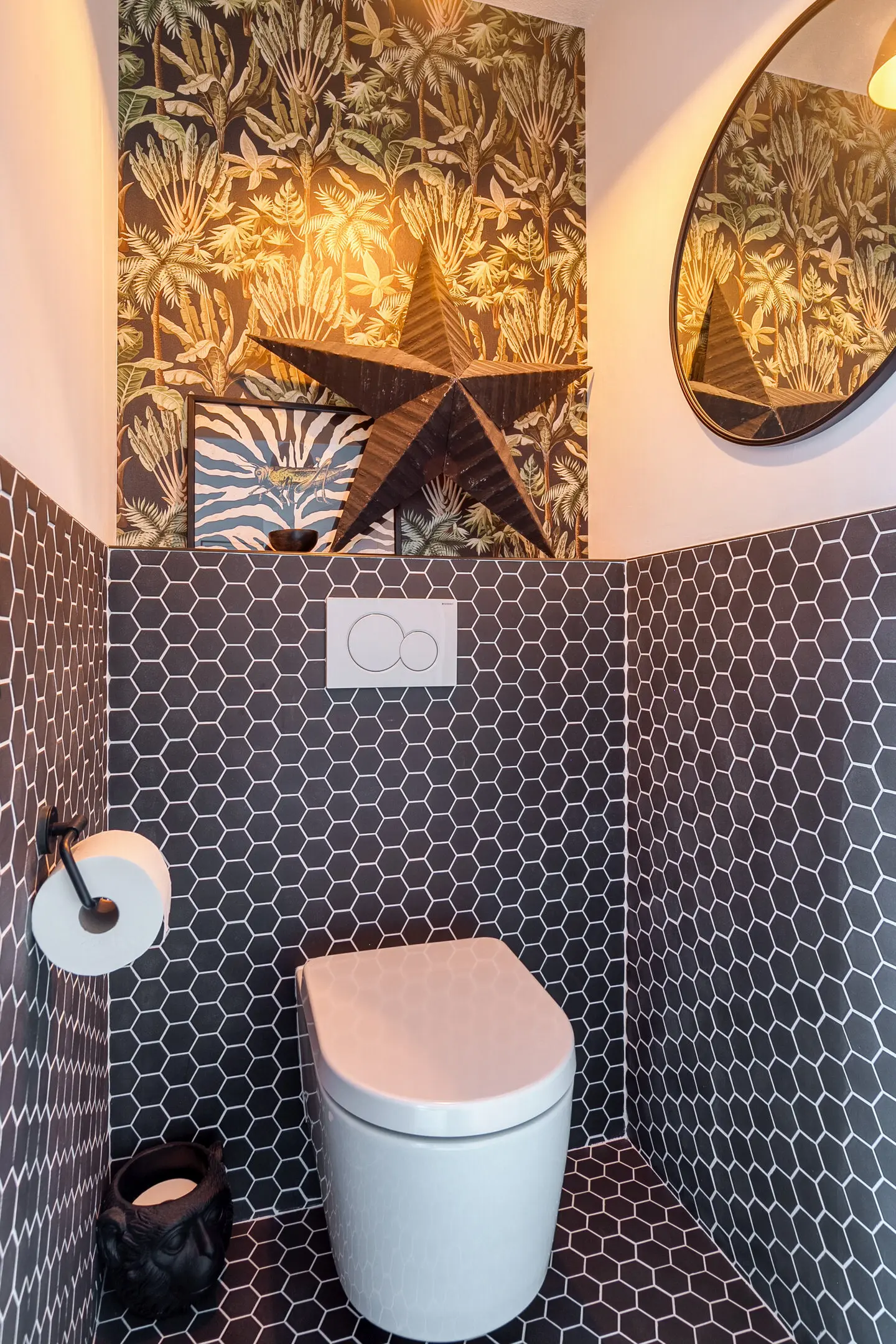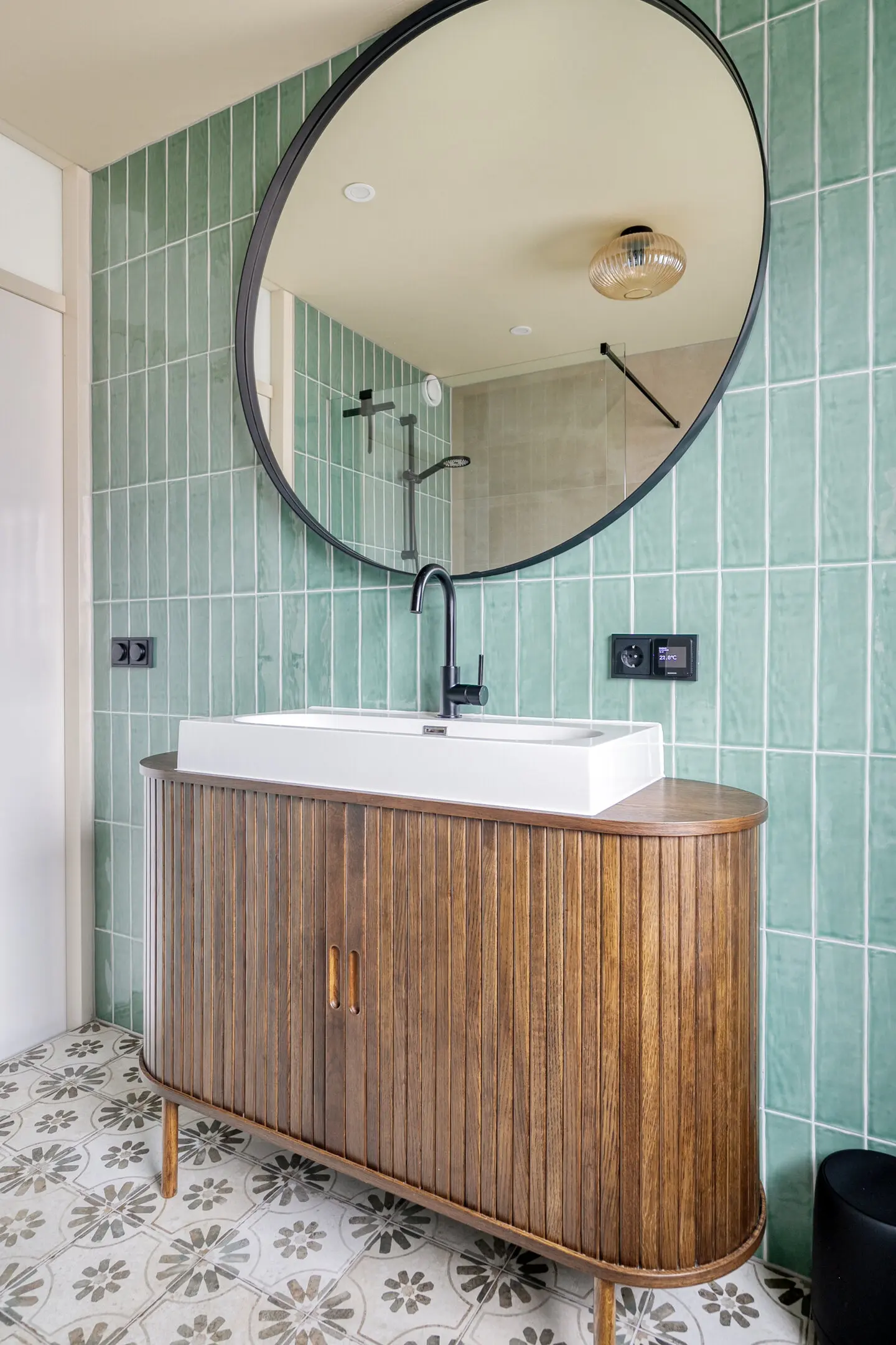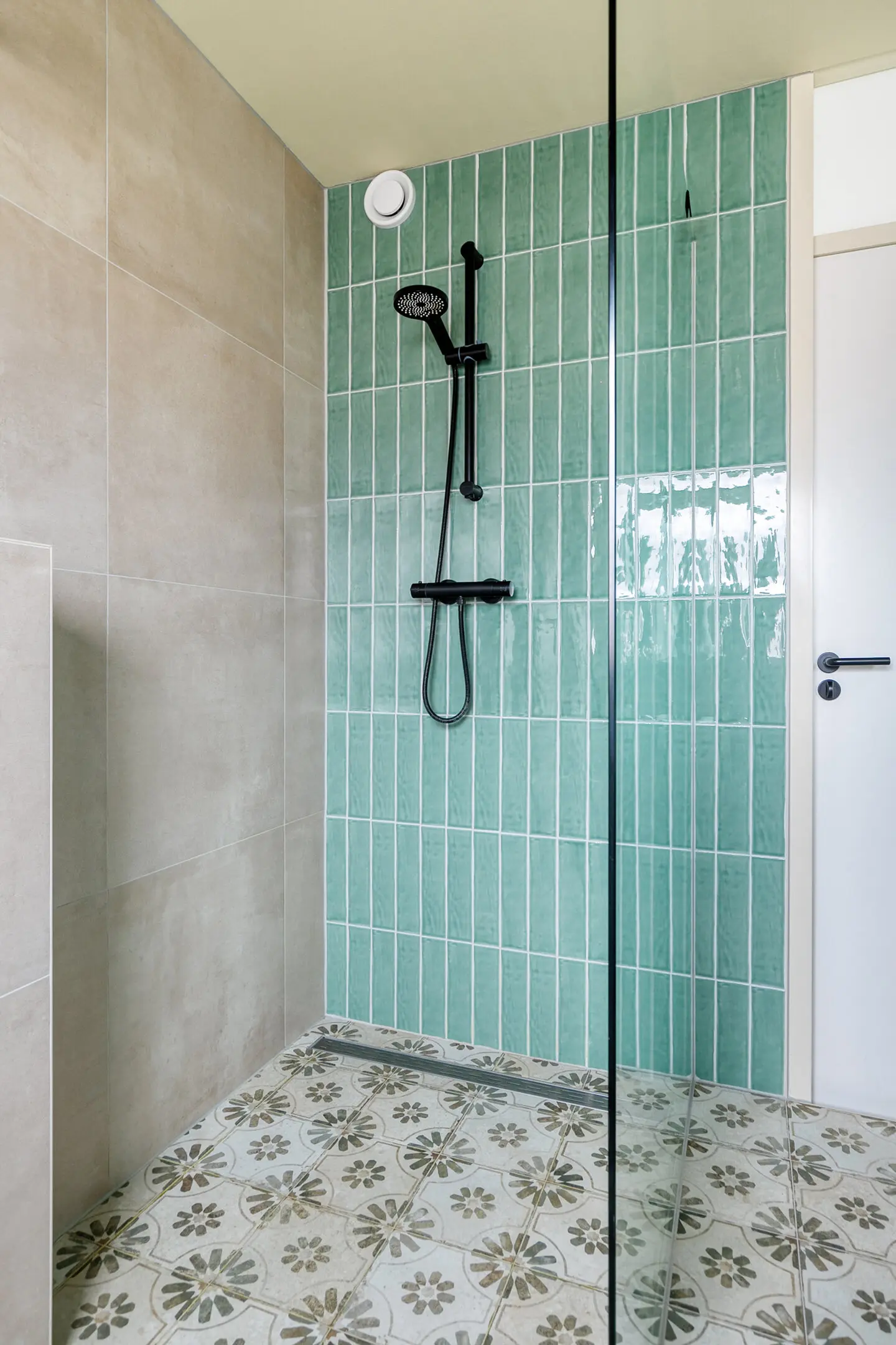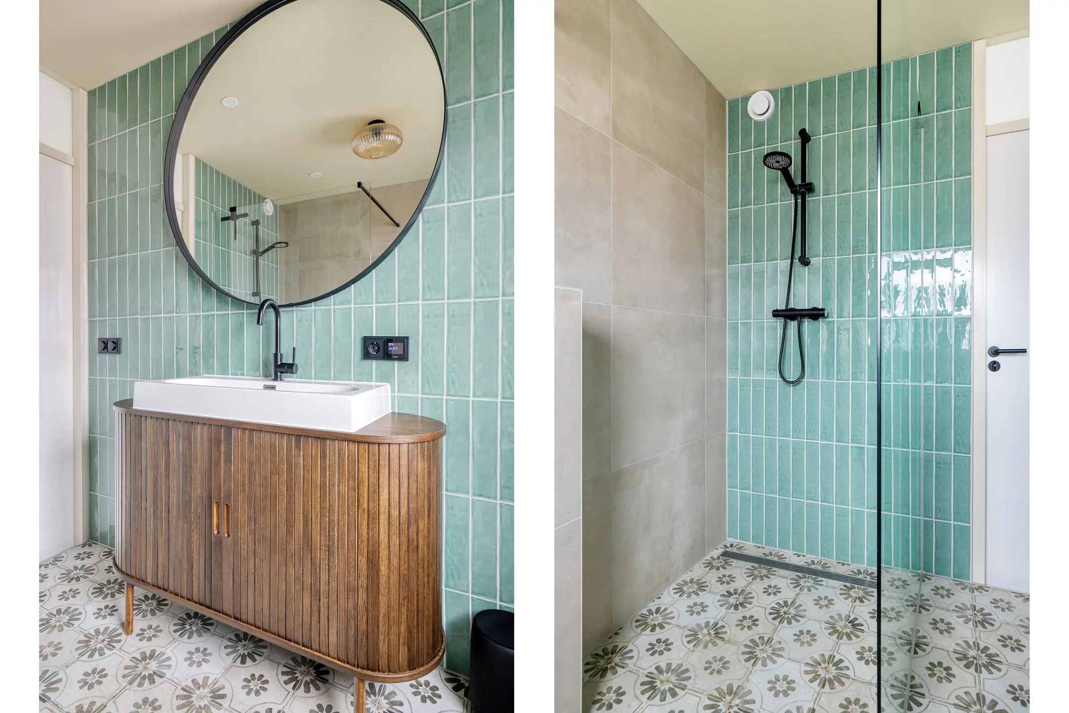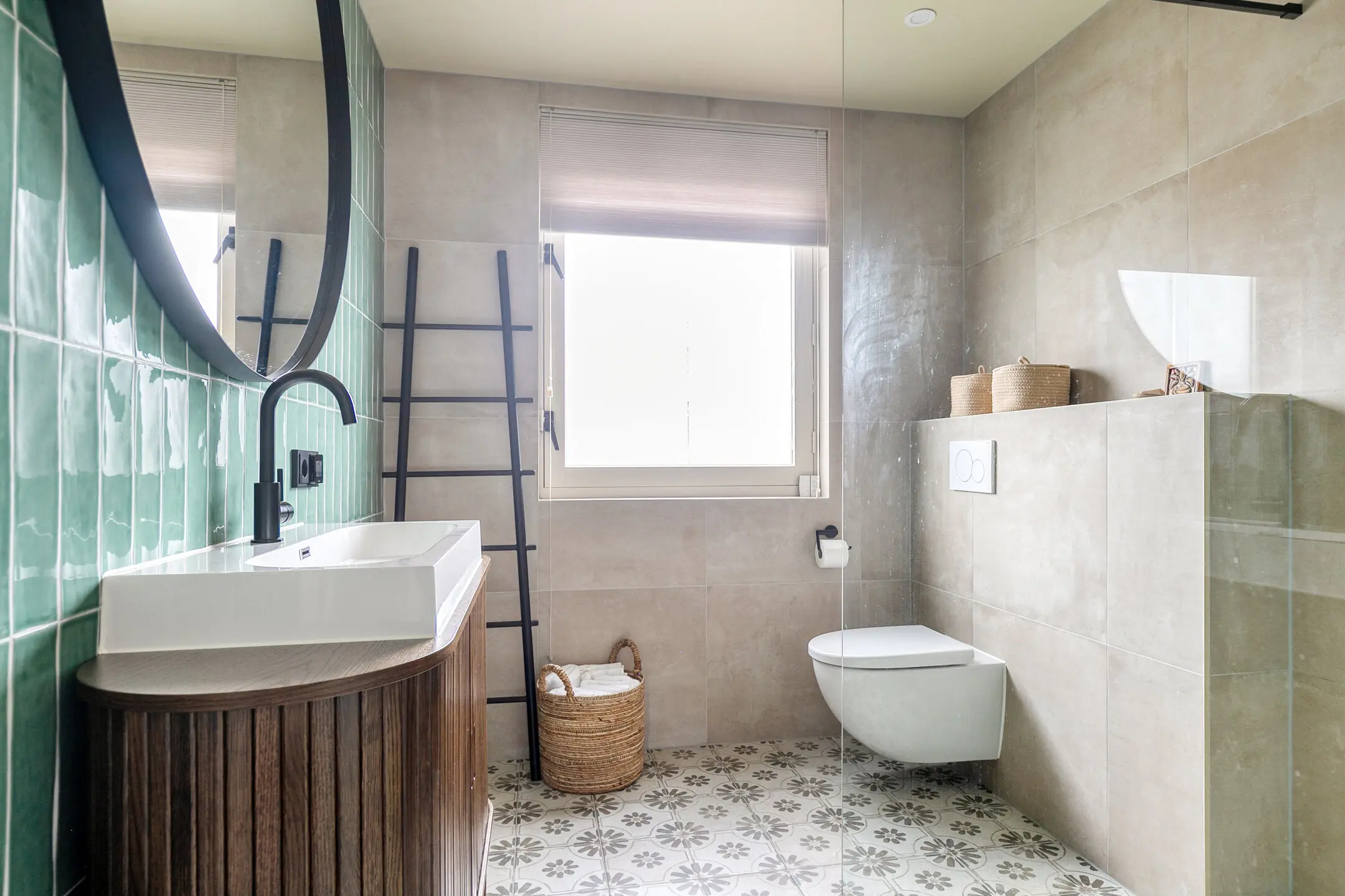 Luxe badkamer in (2023 geïnstalleerd) met vloerverwarming, wastafelmeubel, toilet en inloopdouche.