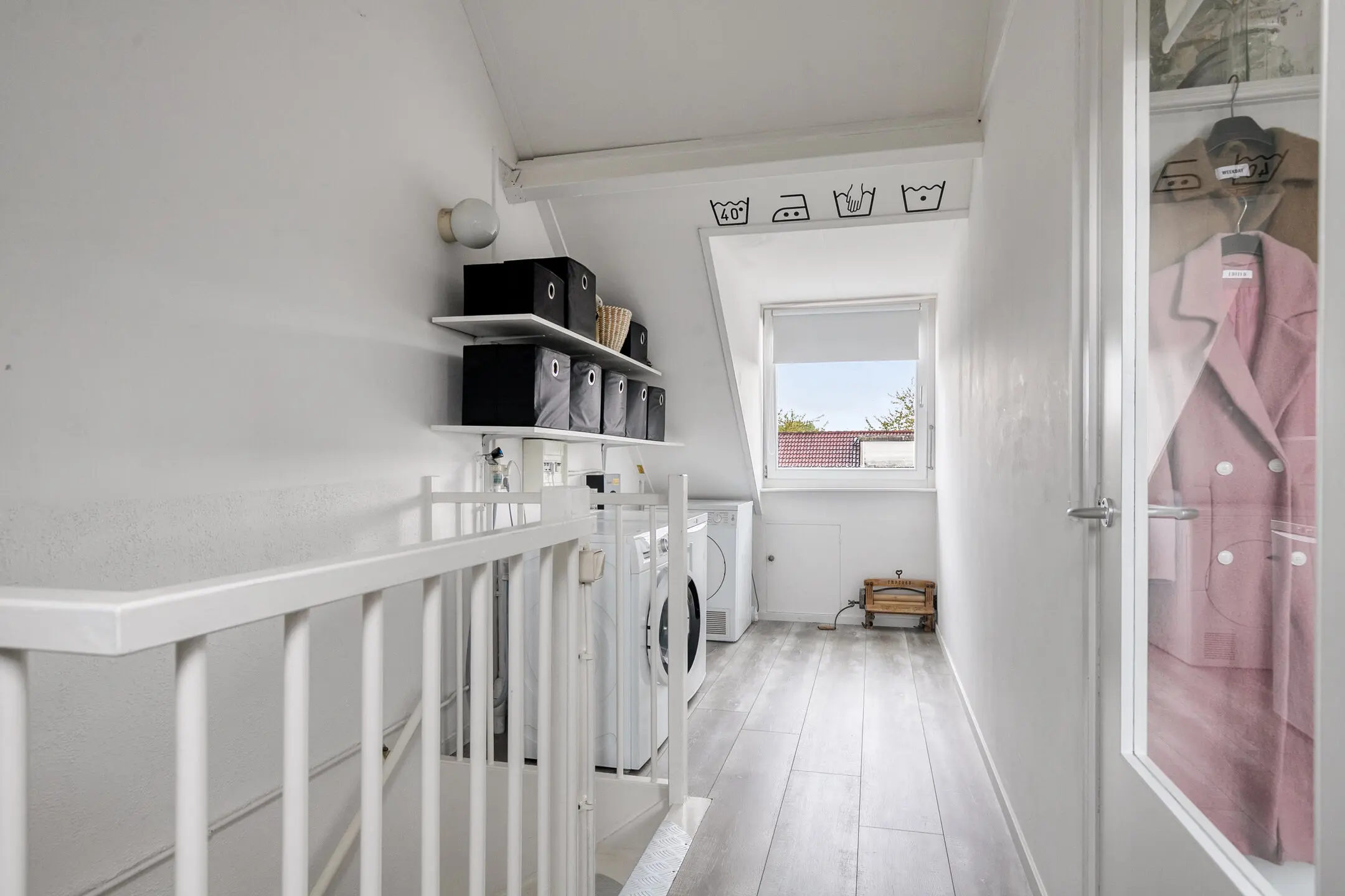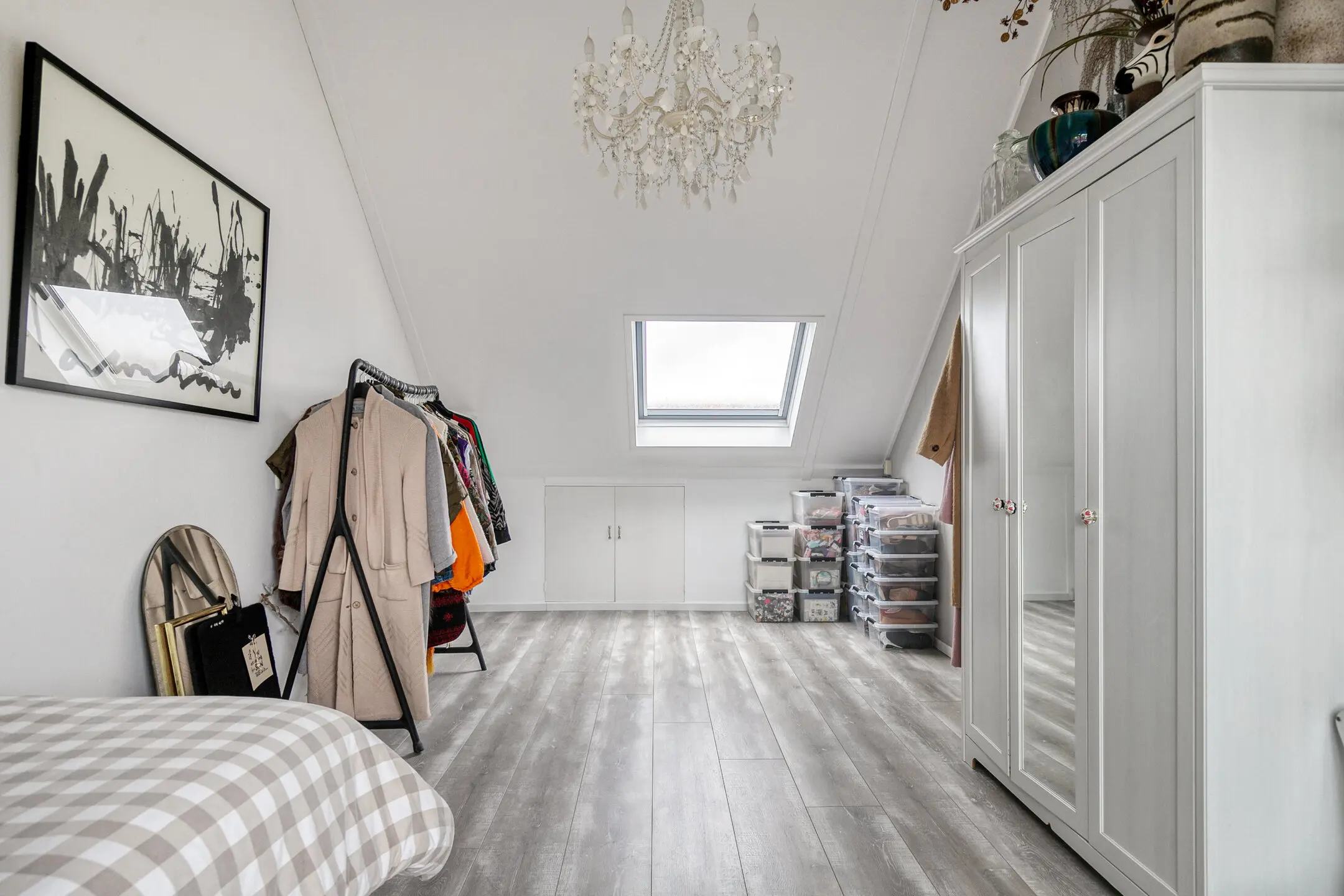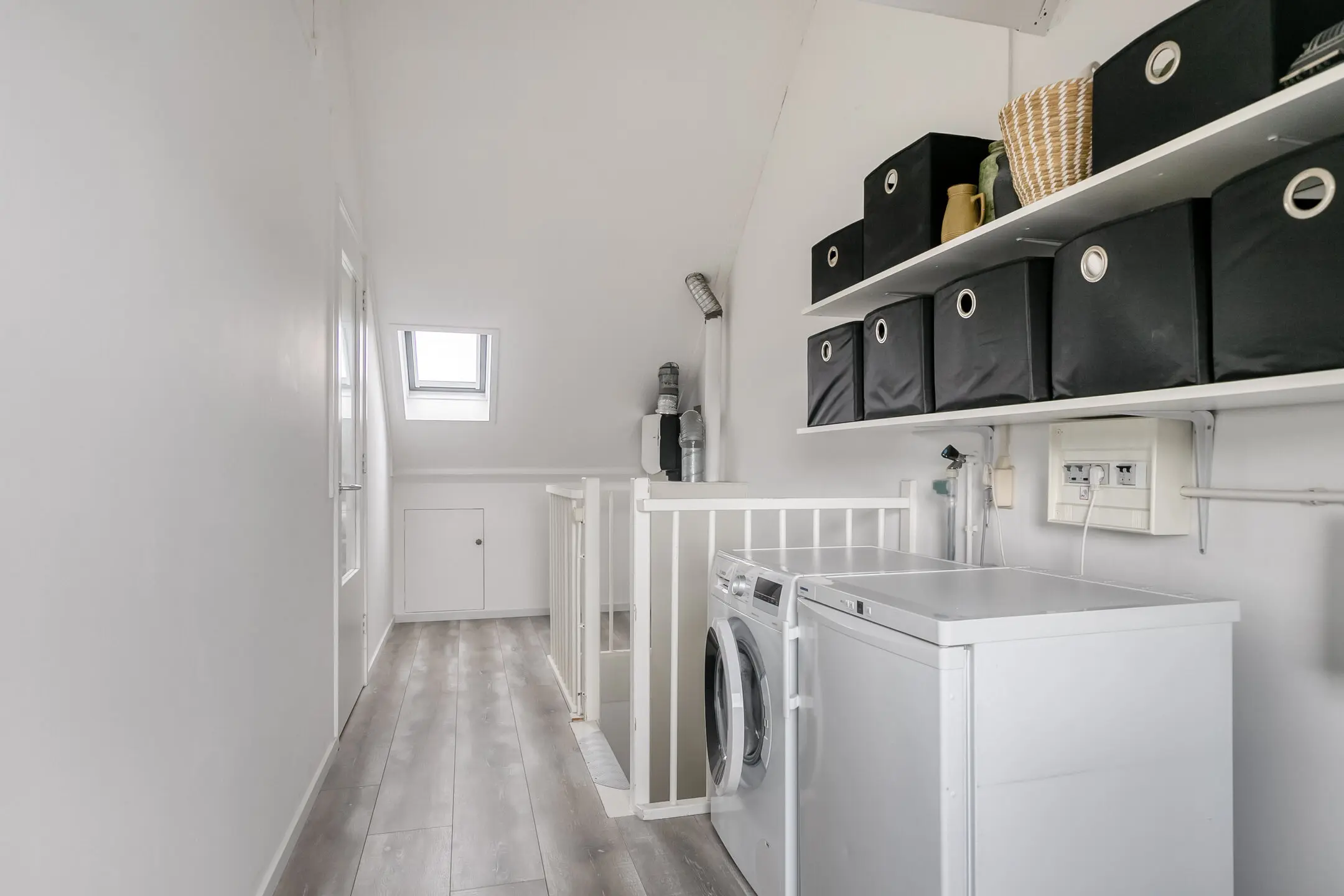 Tweede verdieping; overloop met wasmachine- en drogeraansluiting. Ruime slaap- en/of werkkamer van 4.69m x 3.16m. Achter de knieschotten vindt u veel extra bergruimte.