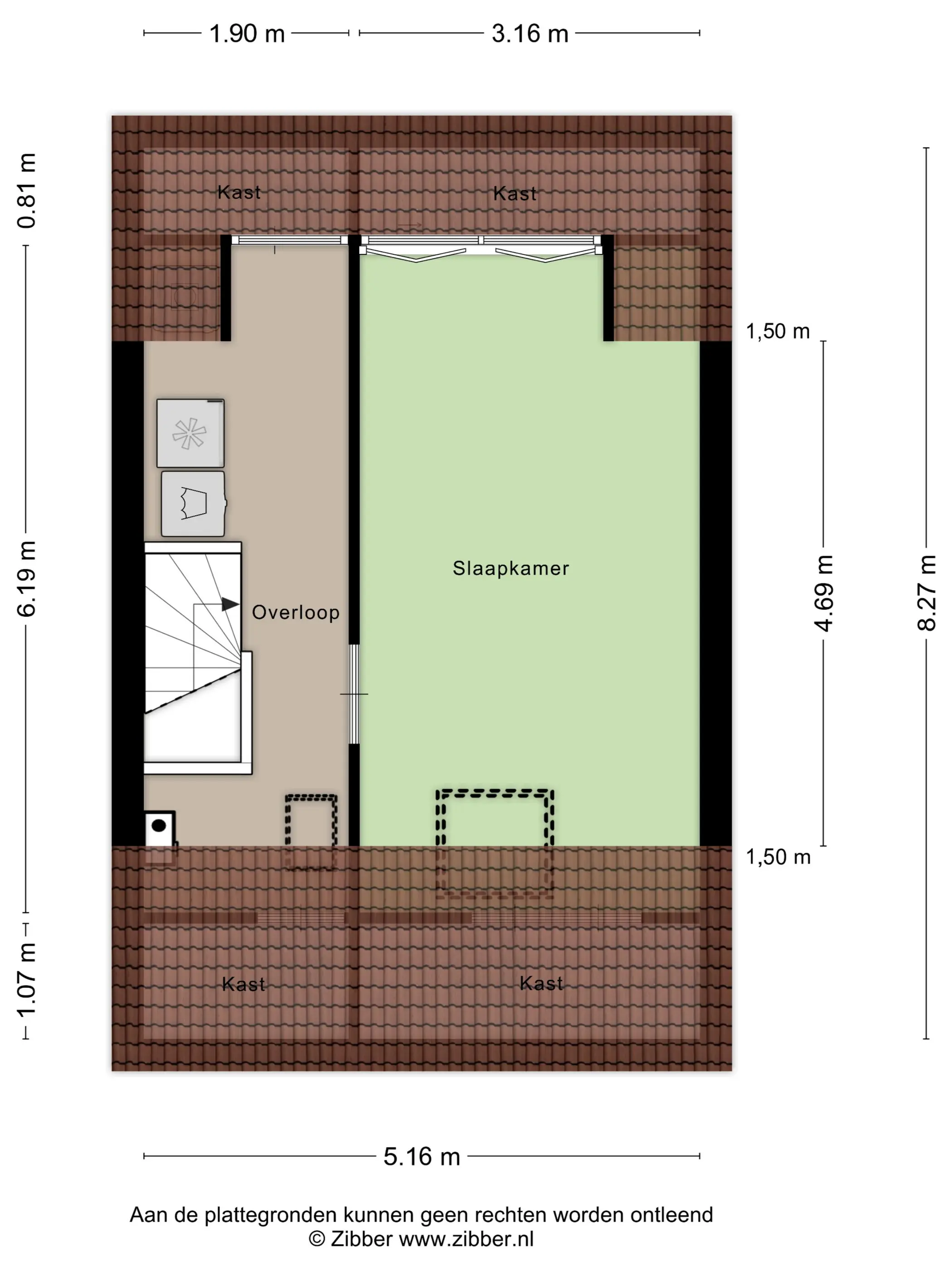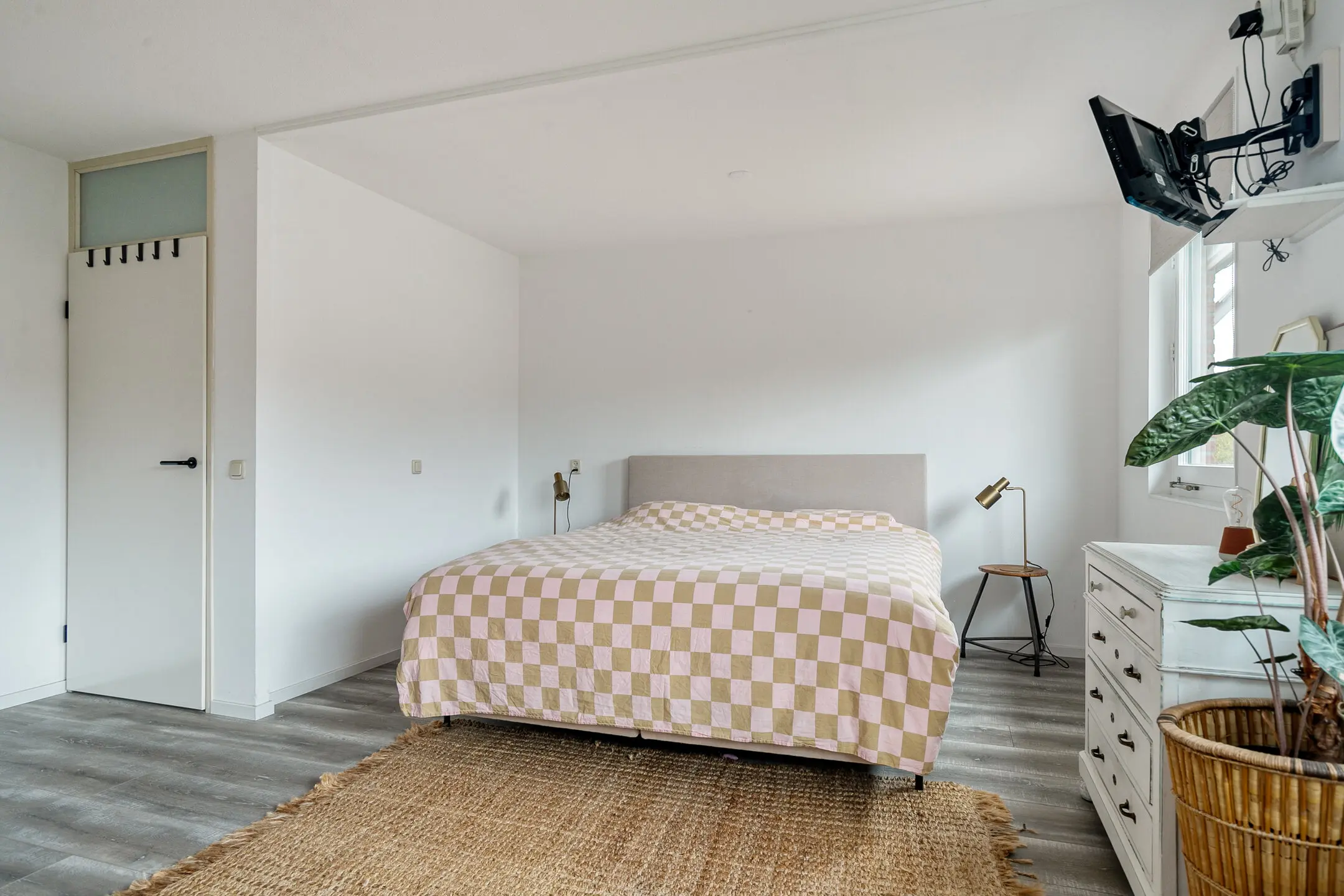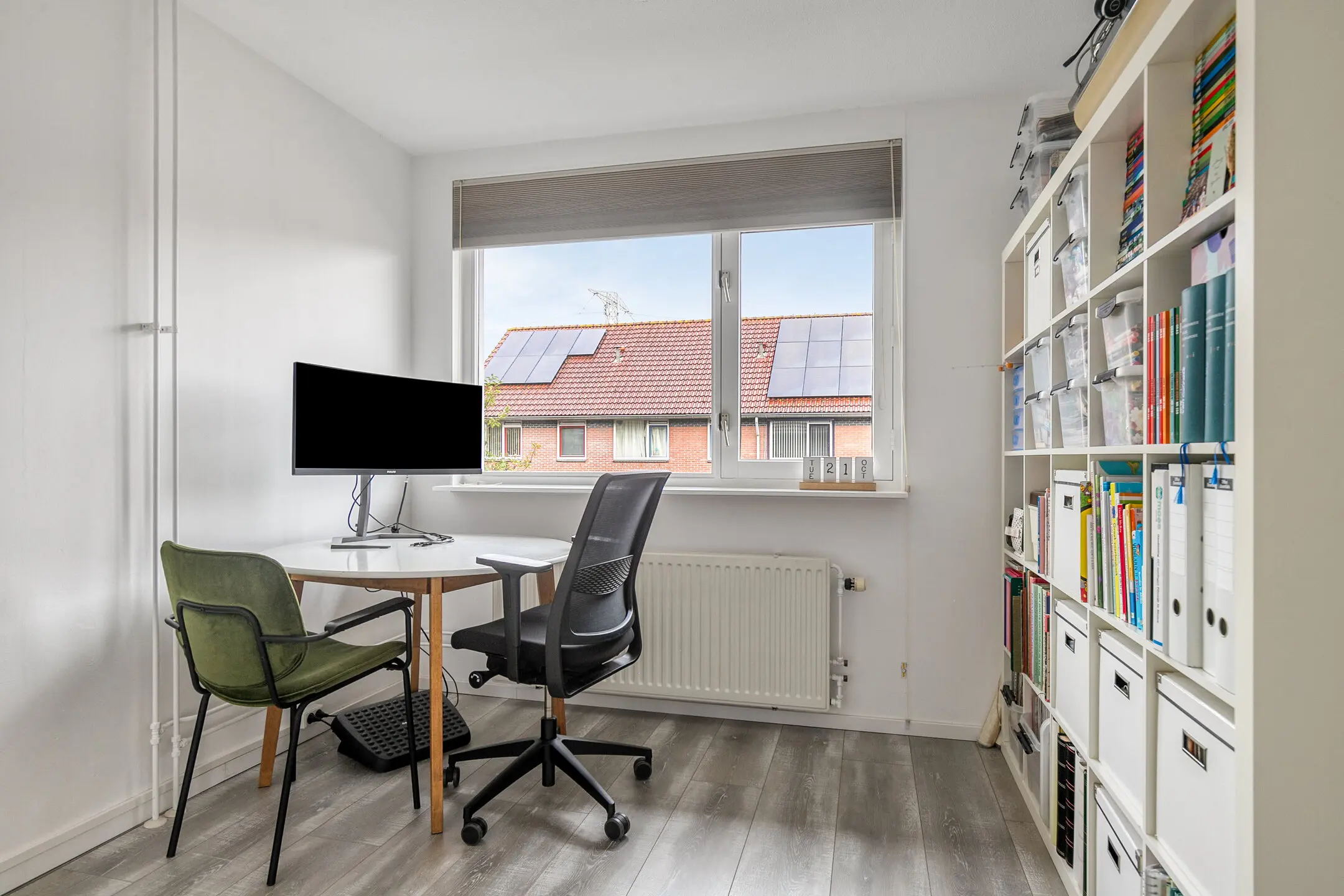 Tweede verdieping; overloop met wasmachine- en drogeraansluiting. Ruime slaap- en/of werkkamer van 4.69m x 3.16m. Achter de knieschotten vindt u veel extra bergruimte.